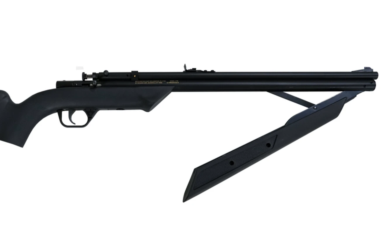 Projektor wyposażono w czarną, syntetyczną kolbę Crosman z podwyższoną baką policzkową, co umożliwia wygodne celowanie i lepszą kontrolę. Poszerzone łoże poprawia chwyt oraz ułatwia pompowanie powietrza. System regulacji mocy pozwala dostosować siłę strzału – od 1 do 10 pompowań – co przekłada się na precyzyjne działanie w zakresie od około 0,6 m do 36,5 m.